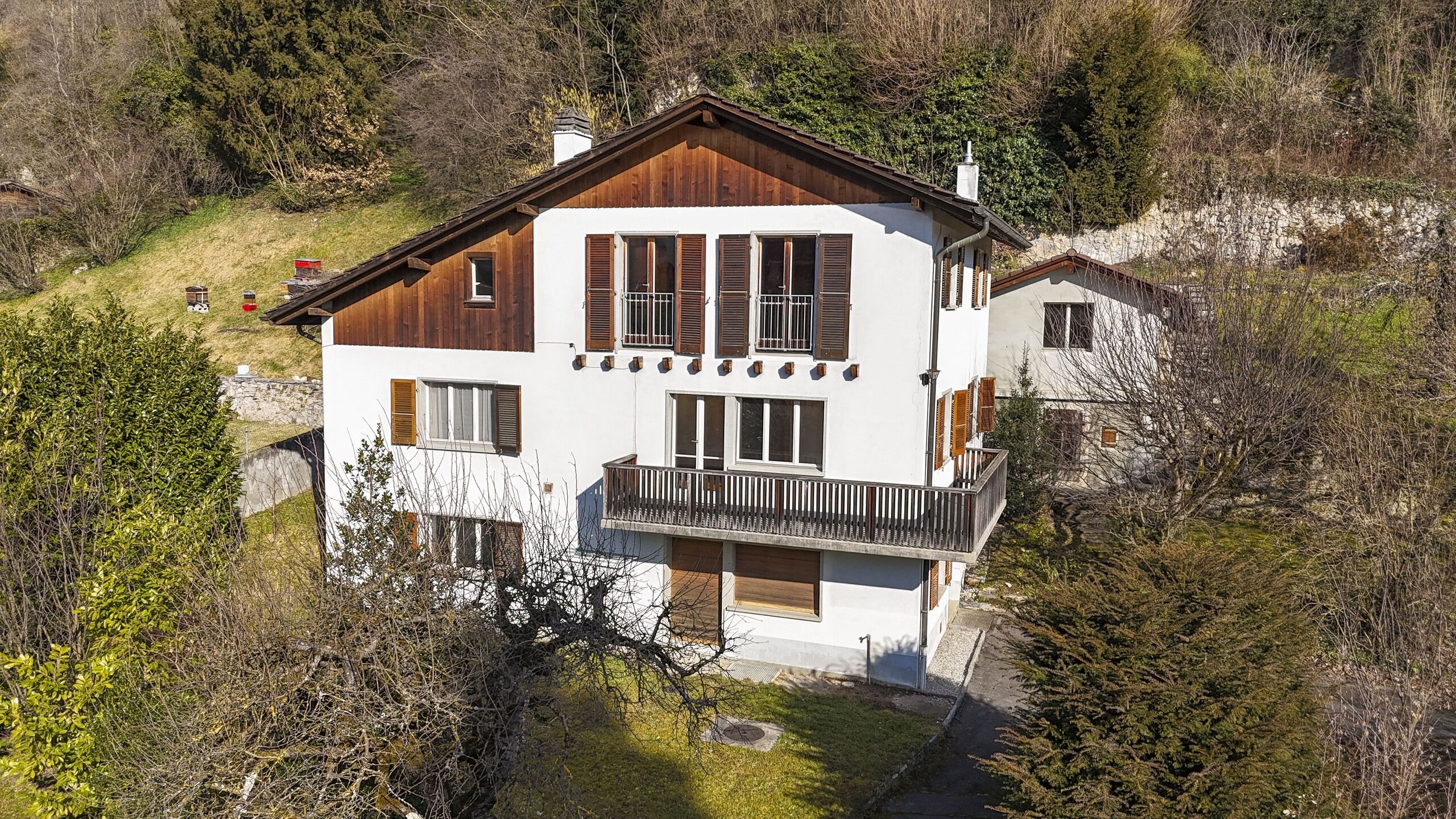 La propriété est situé au sein d'un vaste jardin arborisé offrant un cadre luxuriant et calme à deux pas du centre-ville de Bex et de ses commodités. Un portail commun avec la parcelle voisine permet d'accéder à la propriété et à son chemin d'accès. Plusieurs voitures peuvent facilement y être stationnées.