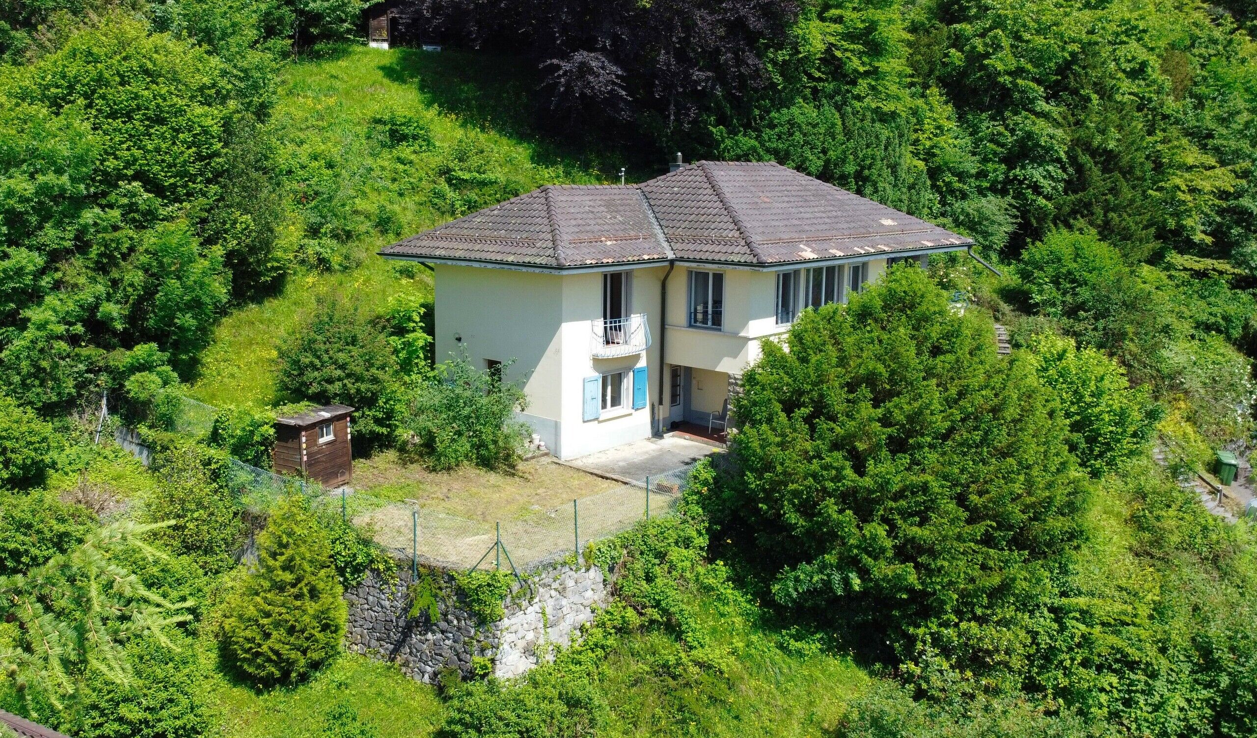 Construite en 1968, elle est sise sur une vaste parcelle arborisée de ~2'106m2. Elle peut aujourd'hui être utilisée comme une maison individuelle de 4.5 pièces ou comme deux logements indépendants (appartement de 3.5 pièces et studio).